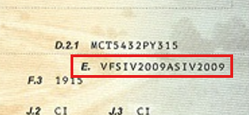 Vous vous demandez où trouver le code VIN sur la carte grise française ? Le numéro de châssis se trouve au champ E de la carte grise :
